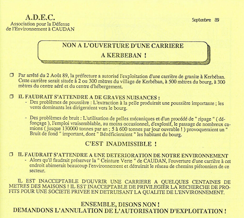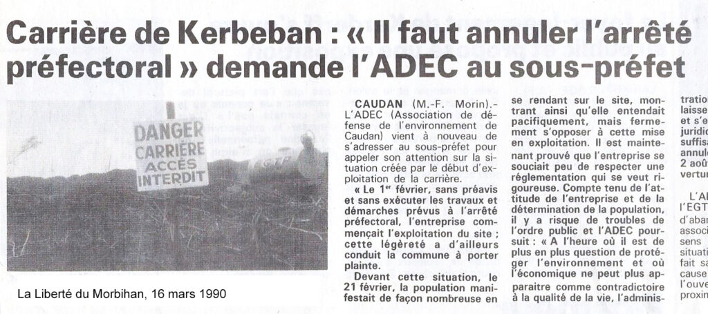 Opposition aux projets de carrière : Kerbéban et Kerustantin 1989 : le préfet accorde à la société EGTP l’autorisation d’exploiter une carrière à Kerbéban, malgré l’avis défavorable de la municipalité. L’ADEC se mobilise, lance une pétition qui recueille plus de 2000 signatures, appelle des manifestations quand les premiers travaux commencent. Suivent 5 années de tentatives de la part de l’entreprise, d’arrêtés municipaux interdisant aux camions les routes communales, de vigilance de notre part.