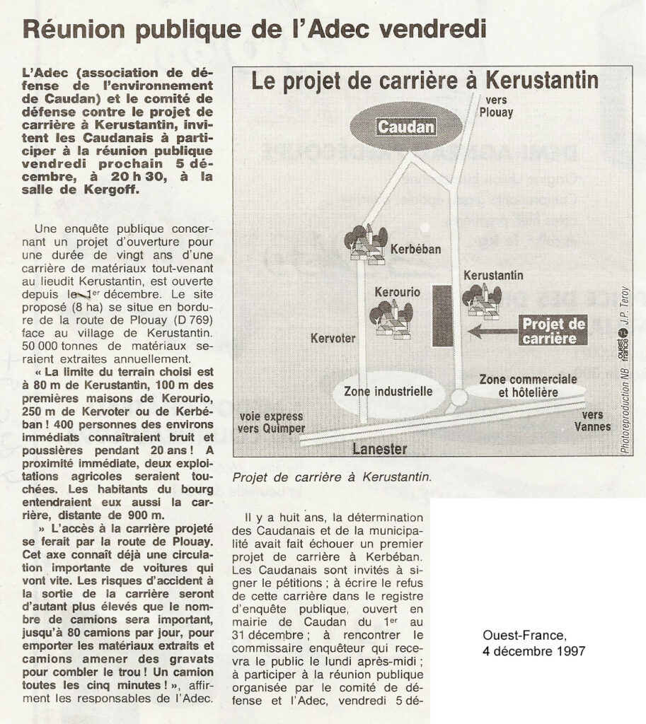 Ce n’est qu’en 1994 que le danger est écarté quand le préfet retire à l’entreprise l’autorisation d’exploiter. Mais en 1997, EGTP lance un nouveau projet de carrière, à Kerustantin. Même scénario : opposition conjointe de la municipalité, des riverains et de notre association, pétitions, manifestations, amorces de travaux, réactions immédiates.